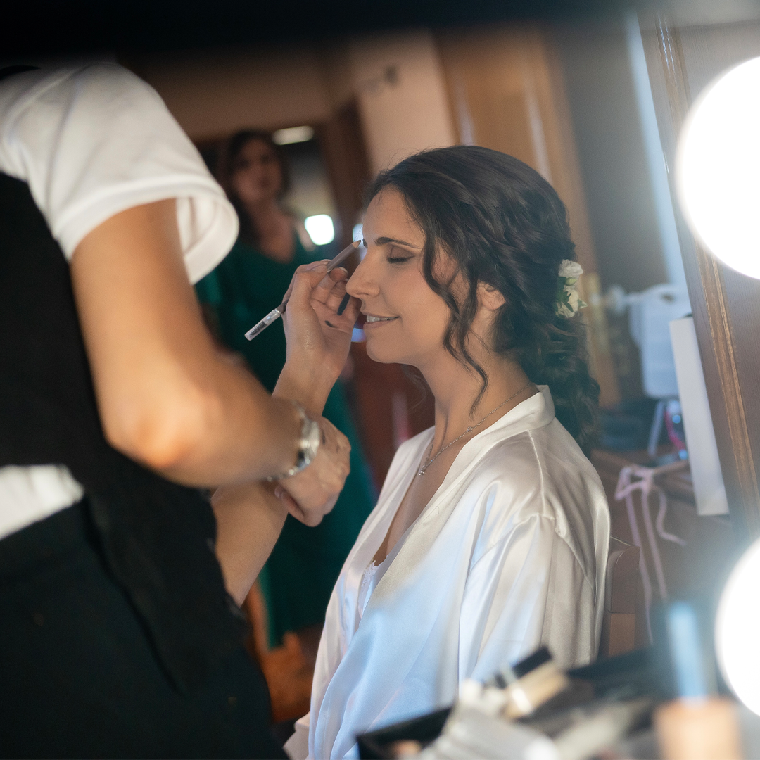 definir o penteado quando na primeira prova ficou definido passamos á make up. Se a noiva ainda tiver dúvidas, fazemos as alterações necessárias. Testamos o acessório escolhido, registamos com fotos e vídeos dos detalhes
